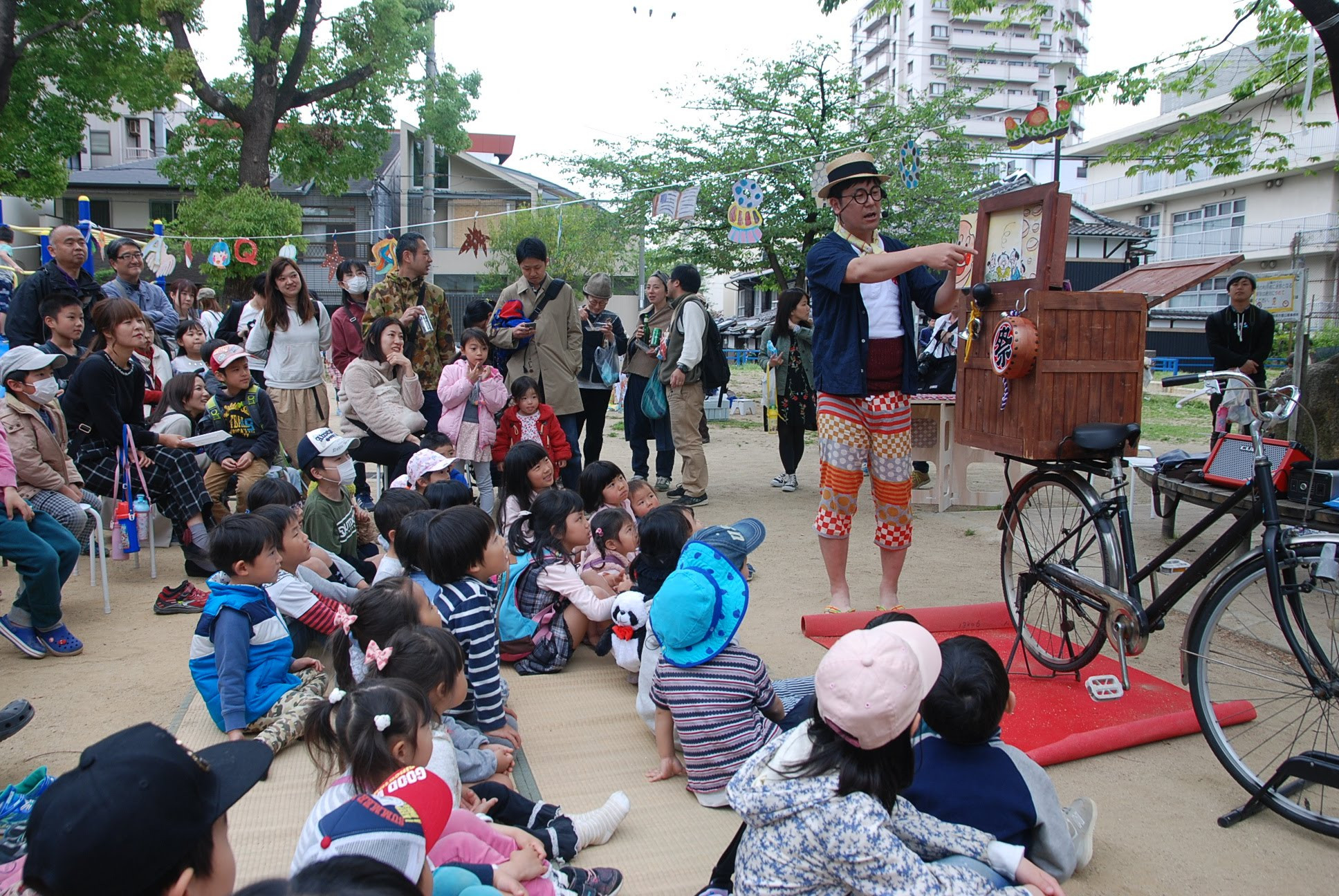 『万博公式キャラクター紙芝居』の動きと並行して、「万博絡めて面白いことできひんかな?」とはちょこちょこっと動いていたので、またまた4月にどっぷり昭和町で『紙芝居パビリオン』という企画もやってみる。